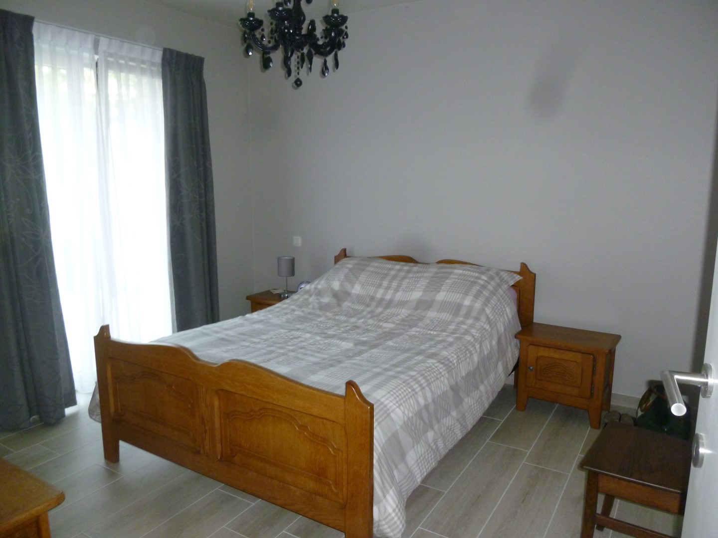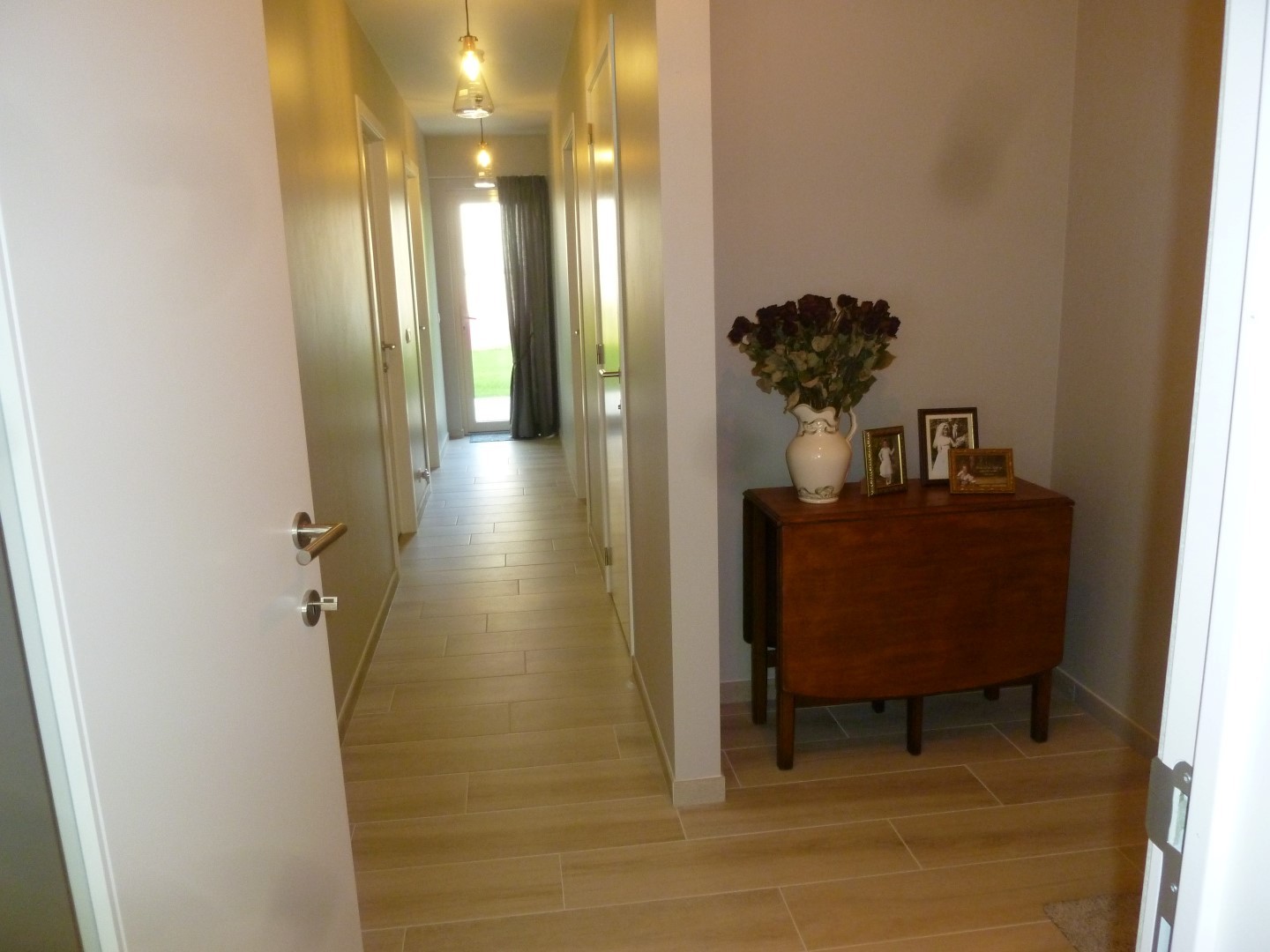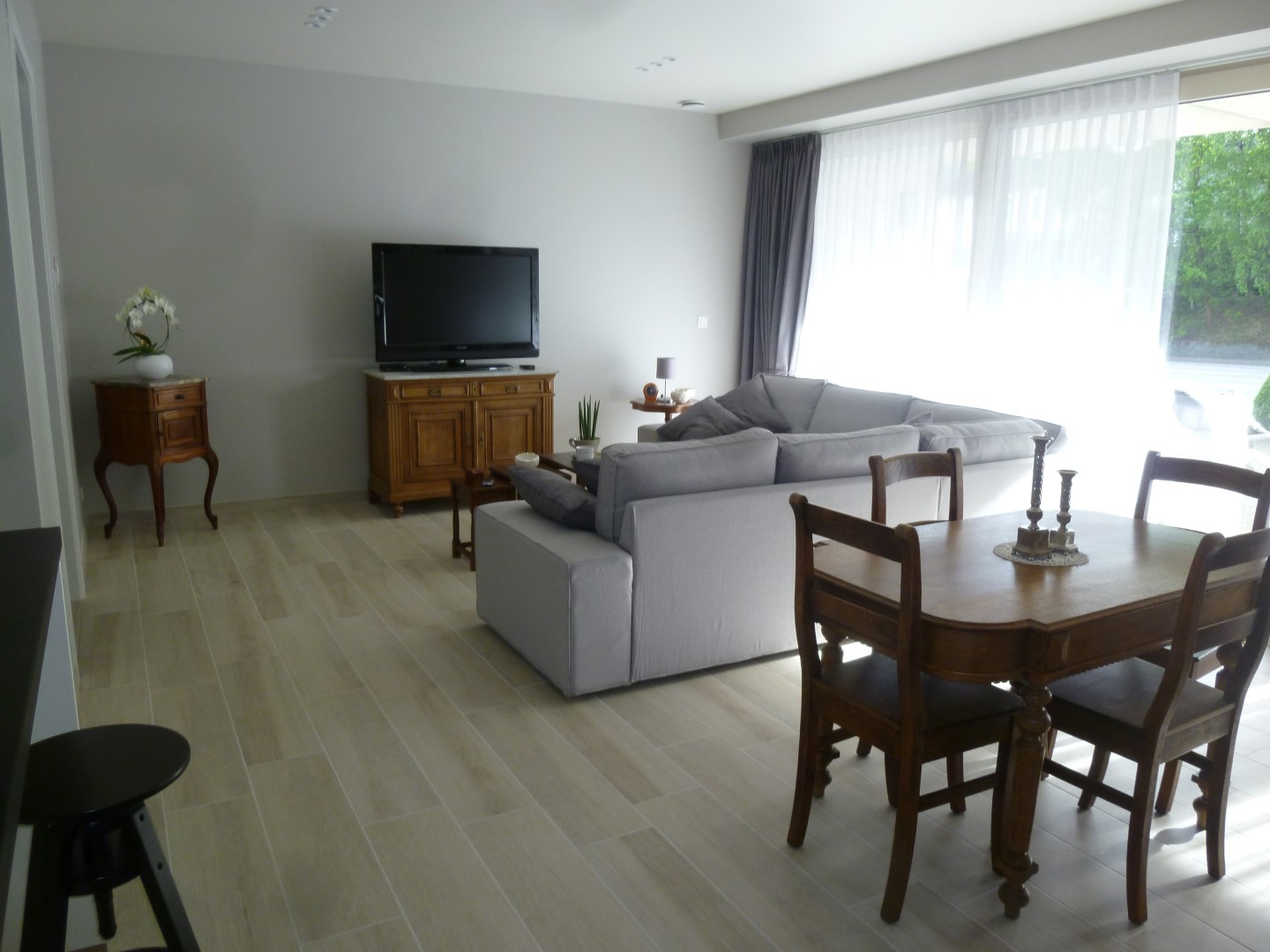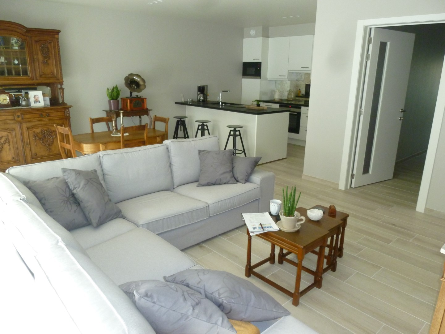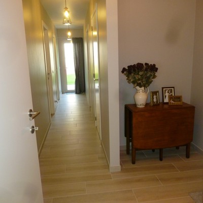 stenen vloeren in hal.living,keuken en badkamer. Laminaat in de slaapkamers